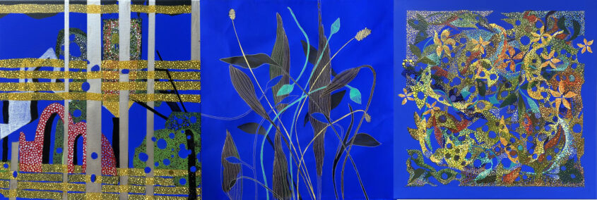 Dans mes peintures récentes, le bleu Klein agit comme fil conducteur, faisant écho à mon passé de modiste et à mon attachement au point comme trace, lien et mémoire.